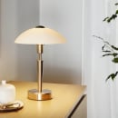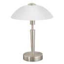 Den eleganta bordslampan Solo 1 från Eglo består av en metallbas i matt nickelfärg och en rund lampskärm i vitt frostat glas. Lampan tänds och släcks enkelt på basen, som har en touchfunktion, och kan också tändas och släckas på traditionellt sätt.