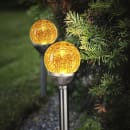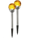 De två solcellsdrivna trädgårdslamporna från Star Trading är mysiga och dekorativa lampor med en gyllene kristallkula på toppen. Trädgårdslamporna lyser med ett varmvitt ljus och har en livslängd på ca 6 timmar på en full laddning.