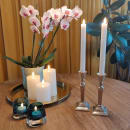 Ljusen är Ø7,5cm. H10cm, 12,5cm och 15cm och har en inbyggd timerfunktion så att de kan tändas i 6 timmar och släckas i 18 timmar efteråt.